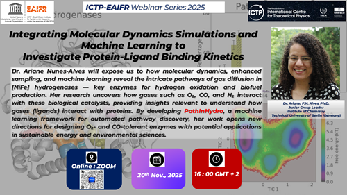 Dr. Ariane F. Nunes-Alves will expose us to how molecular dynamics, enhanced sampling, and machine learning reveal the intricate pathways of gas diffusion in [NiFe] hydrogenases — key enzymes for hydrogen oxidation and biofuel production.